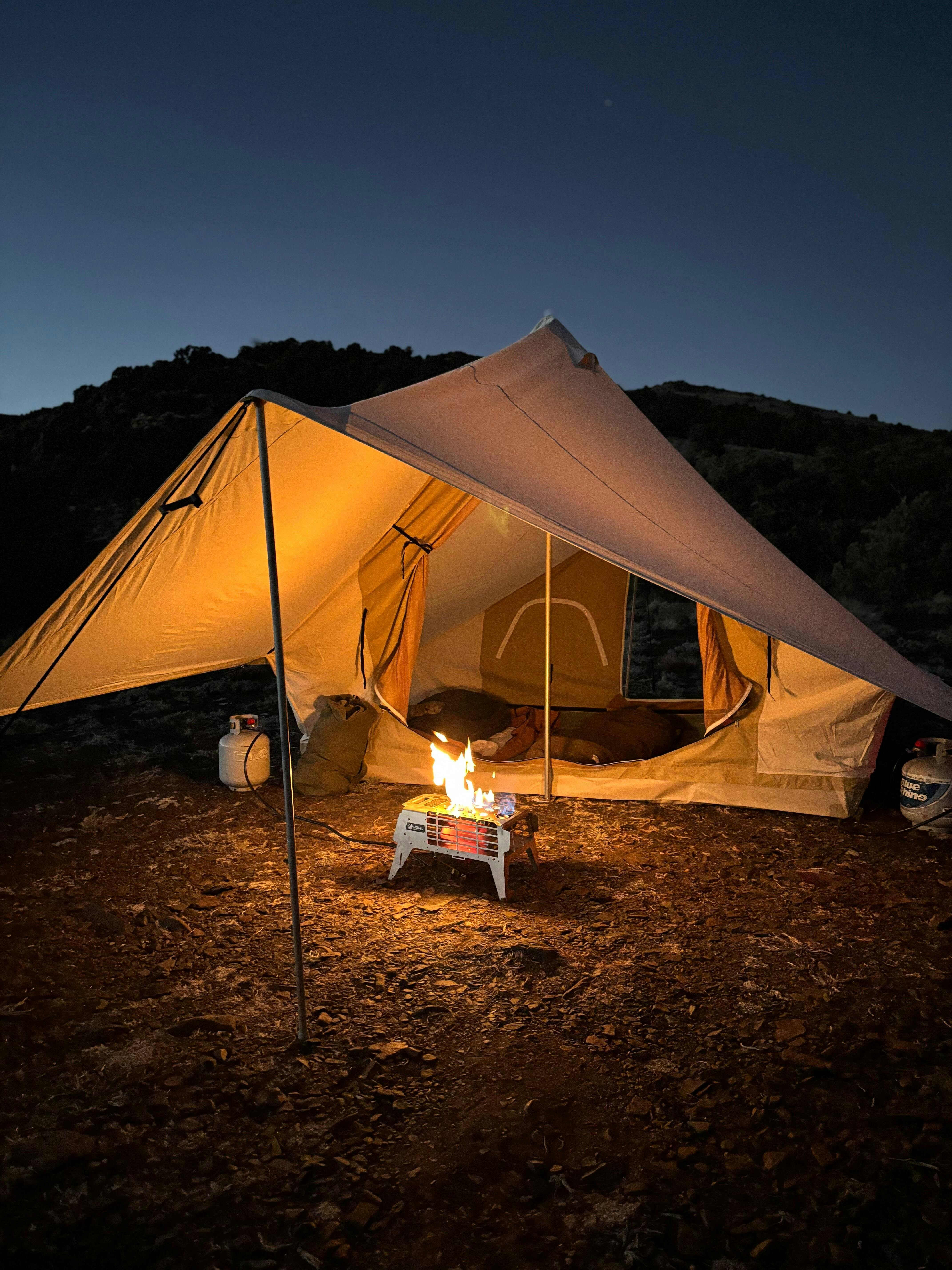 The Split-Torrent tent is the best of both worlds with a fully enclosed sleeping space and an outdoor living area under one canopy. The interior offers an enclosed sleeping area with a large door and window in the back complete with screens as well as a full sized double-door with screens leading to the awning area. The canopy, much like our Shackleton Tent, is built to handle heavy tensioning. This robust construction combined with the angles of the canopy create an incredibly wind-worthy shelter. The awning area provides a perfect space for lounging and cooking while keeping you cool or dry depending on the weather conditions. The relatively low eves offer privacy even in the exterior space while not compromising your view. This 4-season tent is your answer to lazy summer evenings, raucous festivals, and late nights around the campfire.