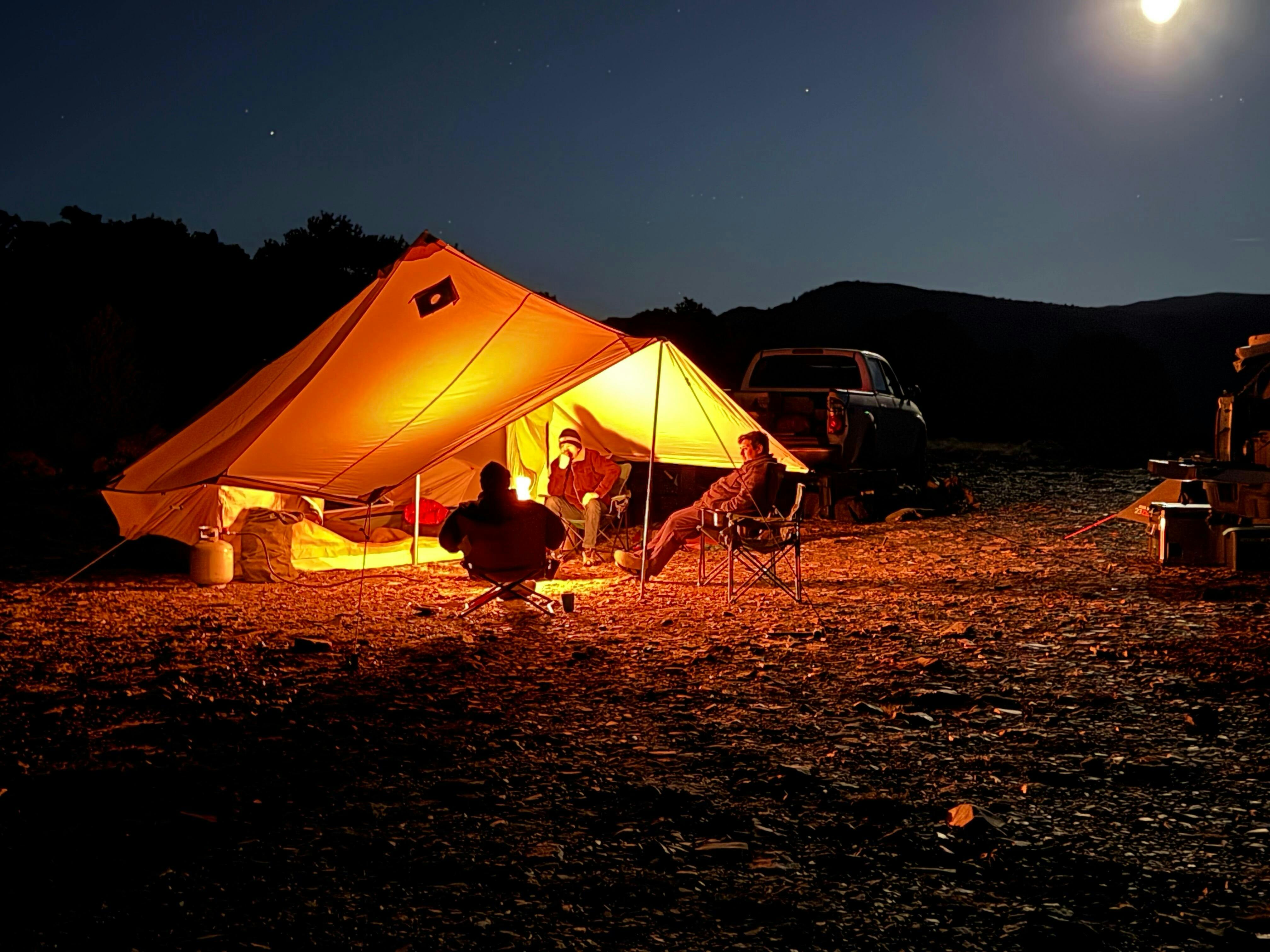 We’ve put outdoor shaded living and indoor sleeping under the same weather-ready canopy as our Shackleton tents. The angled canopy panels mean shade throughout the day and leaving those big doors open all night even in torrential rain. This tent is elegant enough to accomodate wedding guests, yet tough enough to handle an expedition. The cabin area is completely enclosed with integrated doors and screens to keep out unwanted guests while you sleep or lounge, while the shaded front porch is a perfect area to hang in the shade or cook supper in the rain. It’s no wonder this is Dave Ellis’ personal choice for camping.